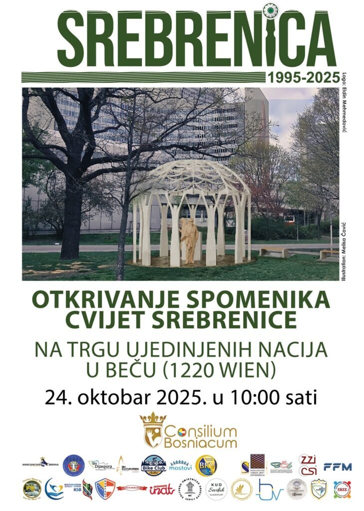 Na Dan Ujedinjenih nacija, 24. oktobra 2025. (petak) u 10:00 sati, na Trgu Ujedinjenih nacija u Beču (1220 Wien) biće svečano otkriven spomenik „Cvijet Srebrenice“, simbol sjećanja, istine i opomene čovječanstvu.