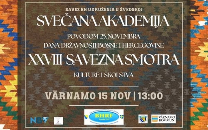 Savez bosanskohercehovačkih udruženja u Švedskoj organizuje Svečanu akademiju povodom 25. novembra Dana državnosti BiH i XXVIII saveznu smotru kulture i školstva