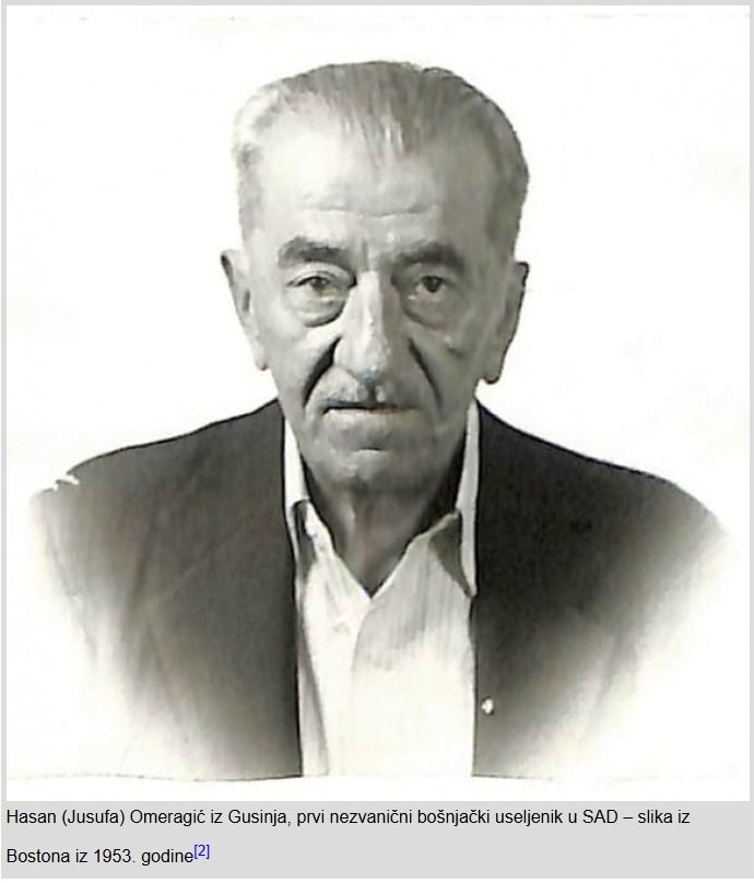 Iseljavanje za SAD je krajem 19. stoljeća i do 1903. g. bilo je pojedinačno. Prvi nezvanični bošnjački imigrant prije 1941. godine je Hasan Omeragić (1863-1960?) iz Gusinja u Sandžaku. Sin je Jusufa Omeragića i Zade Bektešević. Gusinje je u vrijeme njegovog rođenja pripadalo Novopazarskom Sandžaku Bosanskog ejaleta i takvo stanje je trajalo do Berlinskog kongresa 1878. g. Nakon neuspjelog dodjeljivanja Gusinja i Plava Crnoj Gori, ovo područje je uključeno u Pećki sandžak Kosovskog vilajeta (1880-1912). Hasan je došao 2. ili 3. marta 1890. g. u New York, brodom Lombardia koji je plovio iz Napulja za Kanadu, a onda za SAD. U kasnijim useljeničkim dokumentima naveo je da je došao u Pennsylvaniju kod prijatelja Rize Hassana. U New Yorku je najprije obavljao fizičke poslove, a i radio je i kao ulični prodavač. Tu je 1927. g. oženio Mildred Martinovu iz Ukrajine koja je već bila udata za nekog Bodina nakon čega je služila zatvorsku kaznu za bigamiju. Od 1943. g. živio je u Bostonu gdje je radio u restoranu i također bio postolar i čistač cipela. Zadnji dokument iz njegovog života potiče iz 1954. godine. Formalno je promijenio ime u John Hassan. Postoje nepotvrđeni podaci da je umro u blizini Bostona 1960. godine. [1]