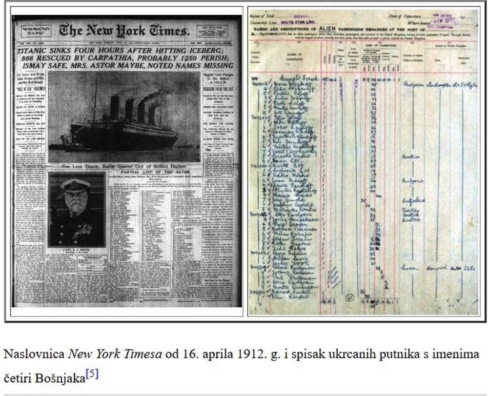 Jedna od najtragičnijih priča je svakako vezana za četiri Bošnjaka iz sela Ostružnica u blizini Badića u općini Bosanske Krupa: Husein Sivić (40), Ejdo Rekić (38), Ćerim Balkić (26) i Redžo Delalić (25). Oni su se 10. aprila 1912. godine u Engleskoj ukrcali na Titanic, brod u posjedu kompanije White Star Line, koji je iz Southamptona krenuo na svoje djevičansko putovanje u New York. Konačna destinacija im je trebao biti Harrysburg, gradić u Pennsylvaniji, gdje se nalazila veća zajednica krajiških Bošnjaka. Nakon pređene dvije trećine planirane rute, Titanic je udario u ledenu santu i ubrzo je potonuo na dno Atlantika. Od ukupno 2.200 putnika na brodu, svega 700 se uspjelo spasiti čamcima koji su spušteni sa broda. Četiri Bošnjaka, iako su vjerovatno imali pojaseve za spašavanje i uspjeli su iskočiti iz broda, brzo su pogledli zbog hipotermije budući da je temperatura vode bila između -2 i 0 stepeni celzijusa. Sretnike koji su našli mjesta u čamcima spasio je brod Carpathia, tj. plovilo koje je ujedno prevezelo najviše Bošnjaka iz Evrope za SAD prije Prvog svjetskog rata. Vlasnik nastradalog broda, kompanija White Star Line, osnovala je fond za pomoć kojim je poslana jednokratna pomoć porodicama žrtava. Tako su pomoć dobili supruga i troje djece Huseina Sivića, supruga Hanče i četvero djece Ejde Rekića, otac Ćerima Balkića (Mujo) i otac Redže Delalića (Džafo).