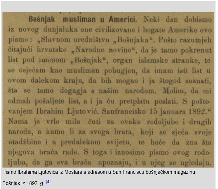Drugi poznati useljenik u SAD je Ibrahim Ljutović iz Hercegovine koji se nastanio u Californiji. Nažalost, jedini dokument koji postoji o njemu je navod u listu Bošnjak iz 1892. g. gdje se govori o njegovom životu u San Franciscu.[3]