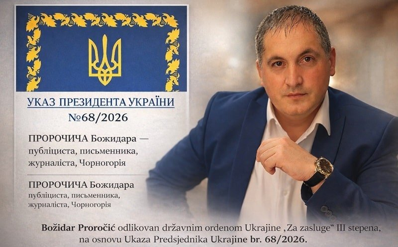 Obavještavamo javnost da je Božidar Proročić, publicista, pisac i novinar iz Crne Gore, odlikovan državnim odlikovanjem Ukrajine – Ordenom „Za zasluge“ III stepena (Орден «За заслуги» ІІІ ступеня), na osnovu Ukaza Predśednika Ukrajine br. 68/2026.