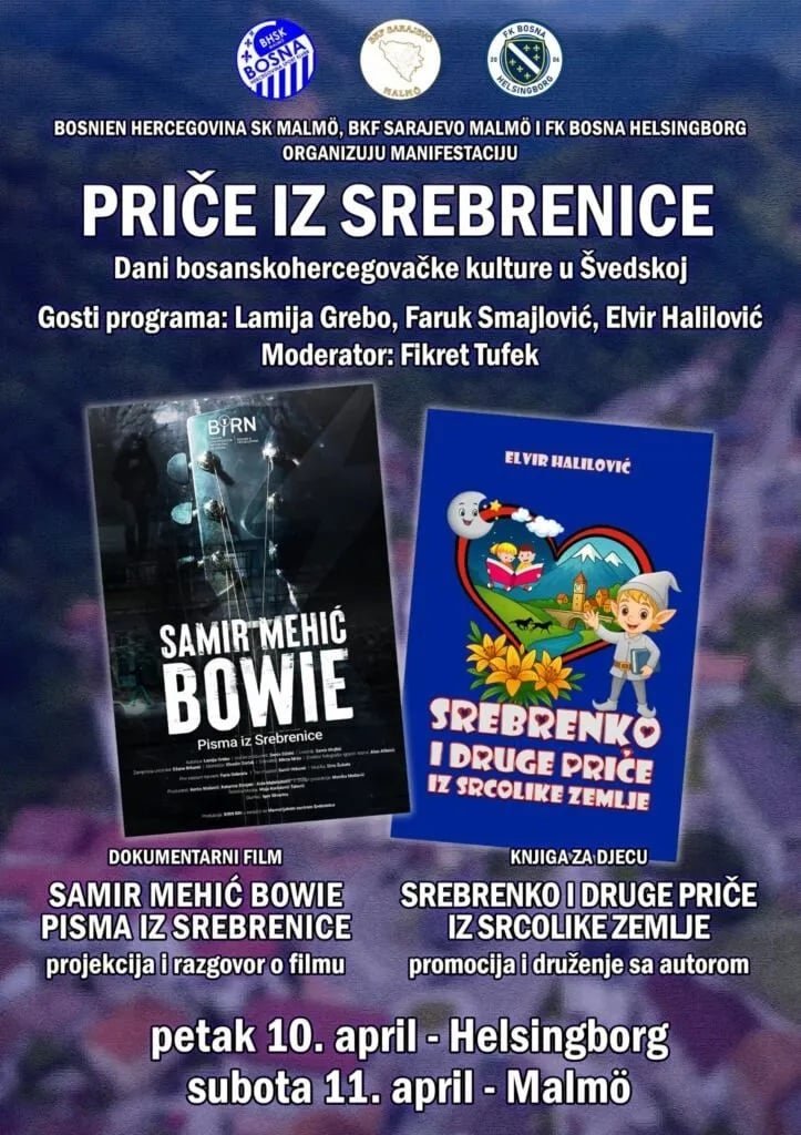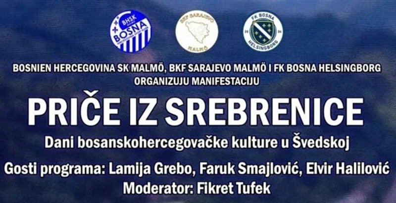 U organizaciji BH Sprtskog kluba Malmö, u saradnji sa BKF “Sarajevo” Malmö i FK “Bosna” Helsingborg, u ovim će se gradovima održati promocija kulturnih sadržaja “Priče iz Srebrenice”, u sklopu Dana bosanskohercegovačke kulture u Švedskoj. U Helsingborgu će se održati 10. aprila u 19 sati, a u Malmöu 11. aprila u 19 sati (Ungdomens hus).